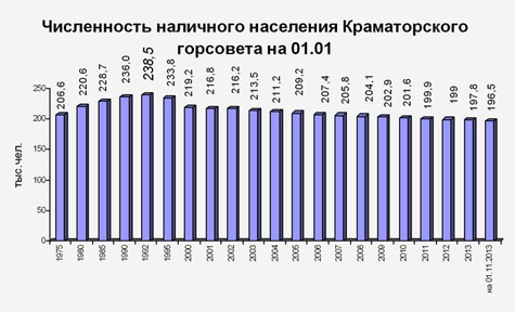 С тех пор Краматорск продолжает терять население, и по состоянию на 1 ноября 2-13 года, в городе проживает 196,5 тысяч человек. В этом году в Краматорске стало на 1206 человек меньше: 1005 умерли, 255 мигрировали.