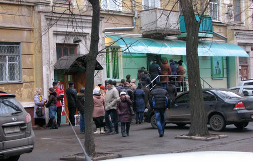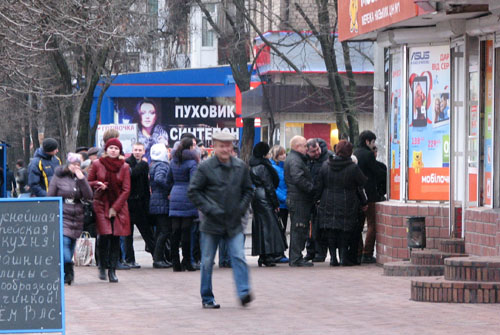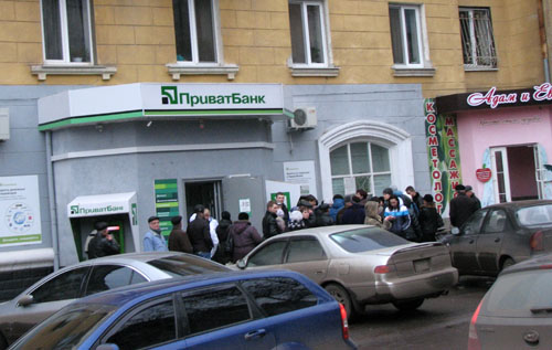 Развитие трагических событий в Киеве, совершенно предсказуемо, начинает вызывать финансовую панику среди населения провинции. Прямо сейчас практически у всех банкоматов Краматорска стоят длинные очереди горожан, пытающихся снять деньги с карточек.
