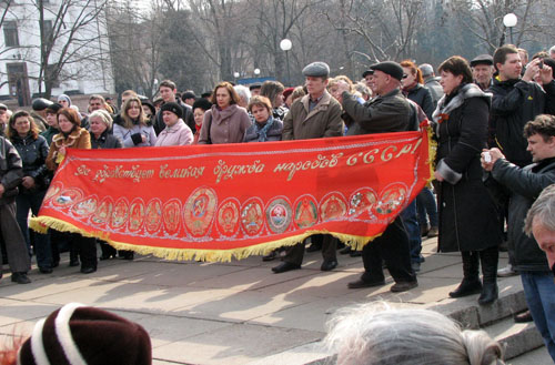 Сегодняшний митинг резко отличается от всех предыдущих: как количеством участников (оно в разы меньше, чем ранее), так и накалом в речах. За час пребывания на площади, мне лично не довелось увидеть ни одного пьяного. Отсутствует (по крайней мере, внешне) оцепление здания горисполкома сотрудниками милиции.