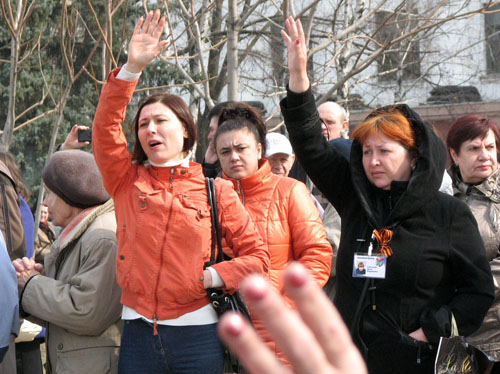 Но самое главное - общее настроение граждан. Несмотря на определенные грозные нотки в речах, почти все выступления граждан сводятся к призывам к миру и согласию. Время от времени, вживую исполняются песни антивоенного содержания, как русском языке, так и на украинском. В толпе отмечен лишь один российский триколор и черно-оранжевое знамя.