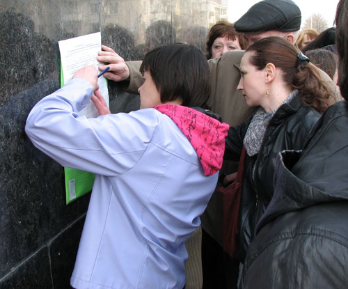 Возле памятника Ленину проводится сбор подписей под требованиям к областным властям о проведении референдума о федерализации, а у здания ДК и Т НКМЗ - запись желающих поехать завтра на аналогичный митинг в Донецк.