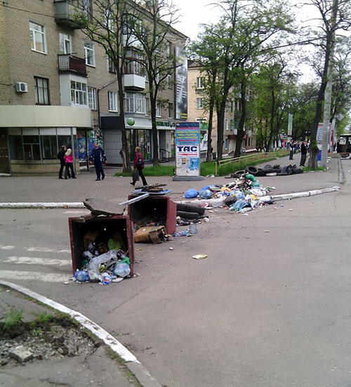 А тем временем, пользователи сети Фейсбук сообщают, что в качестве заграждений на дорогах ополченцы стали использовать сами мусорные баки, со всем содежимым. Вот как это выглядит на пересечении улиц Б. Хмельницкого и Социалистической, в самом центре Краматорска.