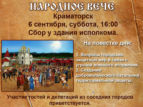 В субботу, 6 сентября, на центральной площади Краматорска пройдет народное Вече, главными темами которого станут: