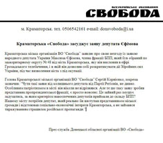 "Краматорська міська організація ВО “Свобода” заявляє про свою незгоду із заявою народного депутата України Максима Єфімова, члена фракції БПП, який був обраний по мажоритарному округу № 48 від міста Краматорська, яку він висловив в ефірі Громадського телебачення, і в якій він дозволив собі розкритикувати дії Збройних сил України, під час визволення міста з під окупації.