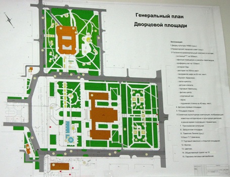Но то, что увидели журналисты на эскизе под названием «Генеральный план Дворцовой площади», заставило насторожиться. Вместо фонтана в Сквере профсоюзов изображен некий объект, который Александр Румянцев определил как «гостинично-развлекательный комплекс на 300 мест, с баром, рестораном, торговыми павильонами, сауной, спортзалом и прочим набором услуг».