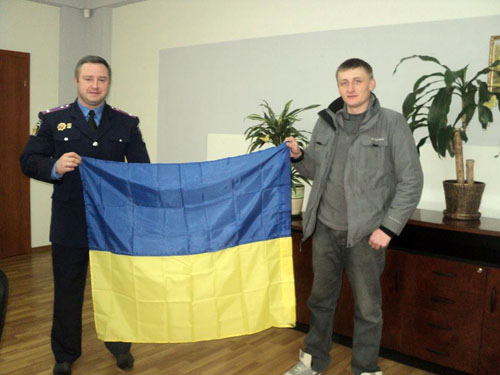 Сегодня он приехал в родной город, чтобы вернуть флаг новому начальнику милиции города Краматорска Сергею Кондрашенко.
