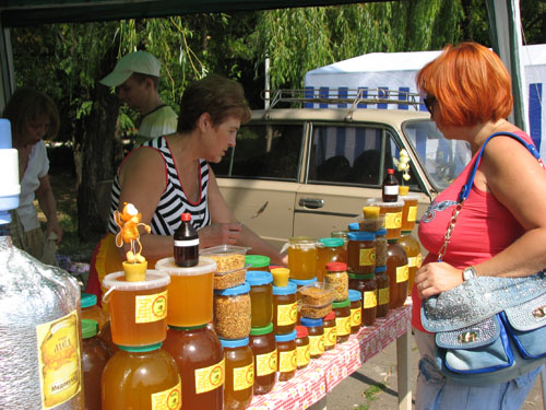 Вокруг фонтана разместились 20 палаток, хозяева которых - члены Краматорского общества пчеловодов-любителей - предлагают посетителям вкуснейшие вещи, начиная от, собственно, самого меда до хмельной медовухи.