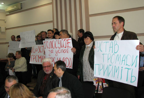 В итоге, за то, чтобы вынести проект Устава на рассмотрение сессии, выступили всего 2 члена исполкома. Однако уже на следующий день вопрос с принятием документа все равно оказался в материалах сессии. Более того, в зале заседаний появилась группа граждан с плакатами в руках, тексты которых требовали от депутатов принятия документа (на фото). И - депутаты Устав приняли. Это решение было встречено общественниками аплодисментами.