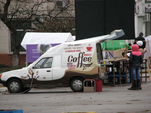 На этой неделе исполком горсовета рассмотрел и удовлетворил заявление предпринимателя Н., который пожелал организовать в Краматорске работу передвижной кофе-машины. Кроме того, аппарат на колесах предлагает желающим чай и горячий шоколад.