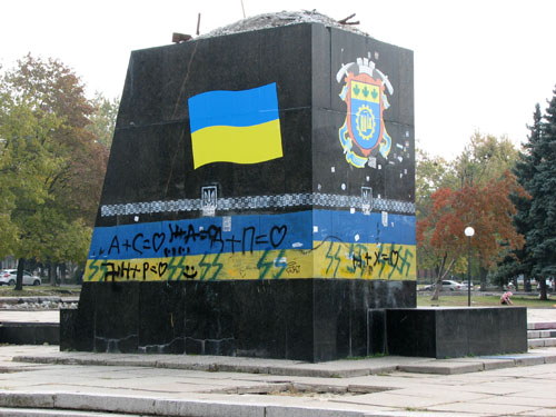 Утром 25 октября постамент снесенного памятника Ленину, до сих пор торчащий на центральной площади Краматорска, оказался разрисованным стилизованными надписями "SS" и фашистскими свастиками.
