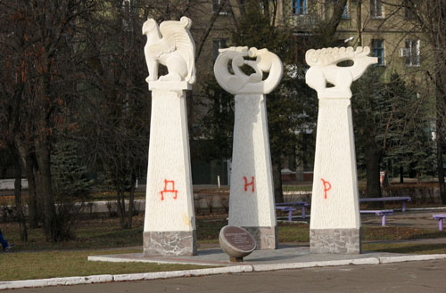В городском суде Краматорска сегодня, 9 марта, состоялось предварительное слушание дела в отношении 28-летнего гражданина, разрисовавшего 10 декабря 2015 года надписями "ЛНР" и "ДНР" скульптурную композицию "Ворота. Лабиринт" у фонтана в Сквере профсоюзов.