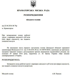 Городской голова Краматорска Андрей Панков подписал распоряжение, согласно которому утвержден состав рабочей группы по проверке деятельности субъектов (всех форм собственности), которые предоставляют социальные услуги.