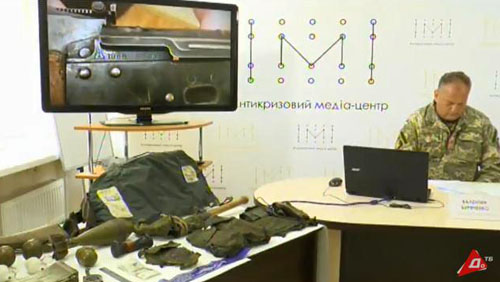 Сегодня в Краматорском антикризисном медиа-центре представитель штаба АТО Валентин Бураченко продемонстрировал журналистам трофеи, захваченные в ходе боя с диверсионно-разведывательной группой боевиков в районе села Новозвановка Попаснянского района 23 июля.