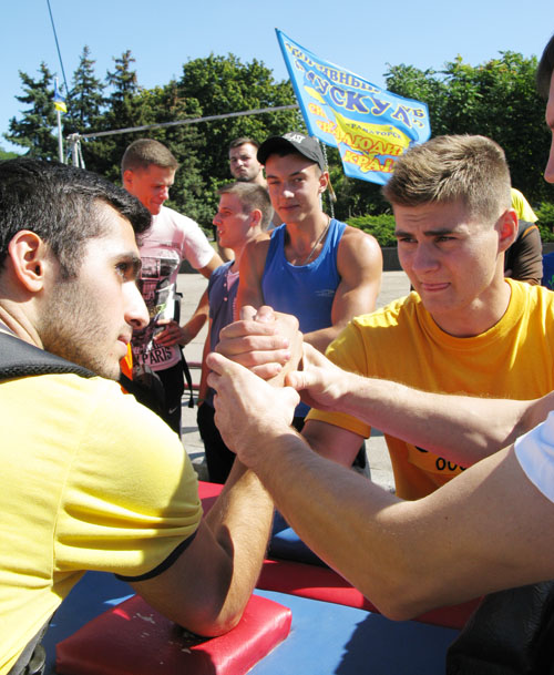 Здесь их уже поджидали "коллеги" из других видов спорта. На площади появился стол для турнира по армреслингу, в котором свою силу мог показать всякий желающий.