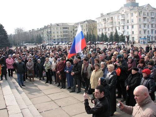 Сейчас на центральной площади Краматорска проходит несанкционированный властями мирный митинг граждан, которые выступают за федерализацию Украины и против неправомерных, по их мнению, действий отдельных группировок националистического толка в различных городах страны.