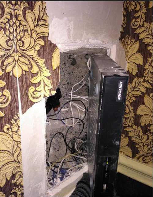 Следующее фото, опубликованное пресс-службой СБУ вчера, 6 февраля, - с места обыска "общественного заведения" в Краматорске, где нашли "жучок". Не правда ли, знакомый рисунок на обоях?