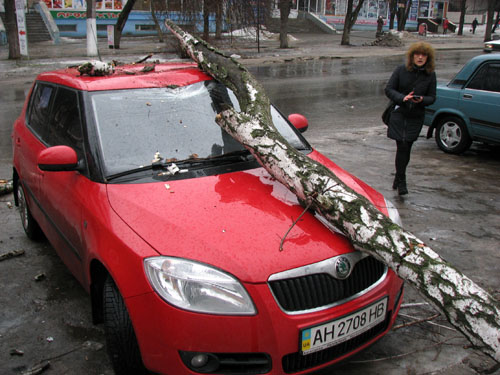 Сегодня, 23 февраля, в Краматорске крупно не повезло владелице автомобиля "Шкода-Октавия", на машину которой рухнула часть сухого дерева.