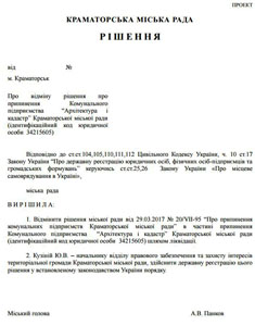 Как следует из текста проекта, депутаты городского совета планируют отменить ими же принятое 29 марта 2017 года решение № 20/VII-95 о прекращении деятельности Коммунального предприятия "Архитектура и кадастр" и заново его зарегистрировать в установленном законодательством порядке.