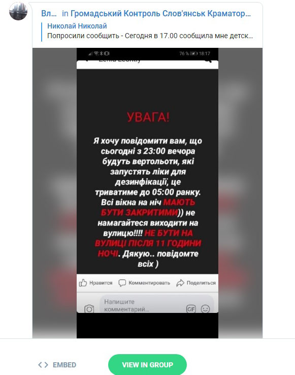 "Сейчас в Сети распространяется ложная информация о, якобы, дезинфекции города Краматорска с самолетов сегодня ночью. Заверяю жителей, что это - фейк, который не соответствует действительности. В случае необходимости и при наличии любой важной информации относительно распространения коронавируса, мы в кратчайшие сроки сообщим об этом на официальном веб-сайте (Краматорска). Пожалуйста, сохраняйте спокойствие и доверяйте лишь официальным источникам информации!"