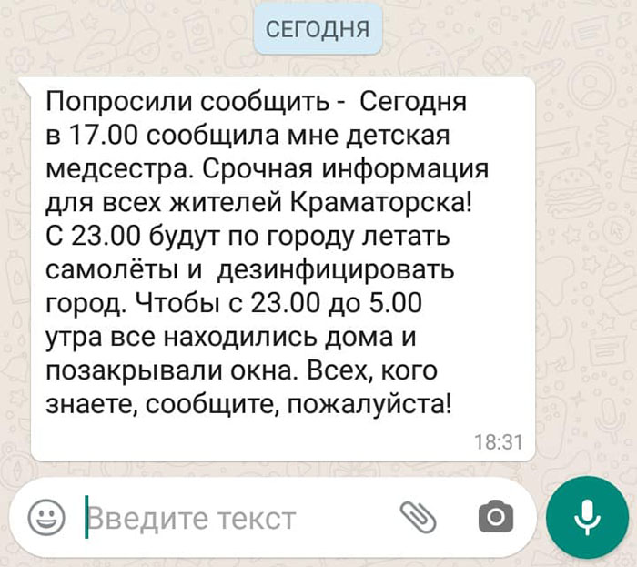 Сегодня, 16 марта, в краматорских группах соцсетей и прочих источниках массовой коммуникации ВДРУГ стала дикими темпами распространяться информация о том, что, якобы, в период с 23 вечера до 5 часов утра завтрашнего дня Краматорск будет подвергнут "дезинфекционной обработке" с использованием авиации. Скорость распространения этой, совершенно очевидно, лживой информации может свидетельствовать о том, что делается это целенаправленно.