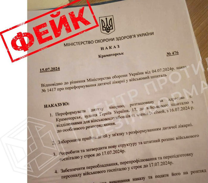 Російські пропагандистські ресурси поширюють фейк про нібито рішення Міністерства охорони здоров’я України перетворити єдину дитячу лікарню в Краматорську на шпиталь для військових. Як доказ росіяни поширюють буцімто відповідний наказ МОЗ України.