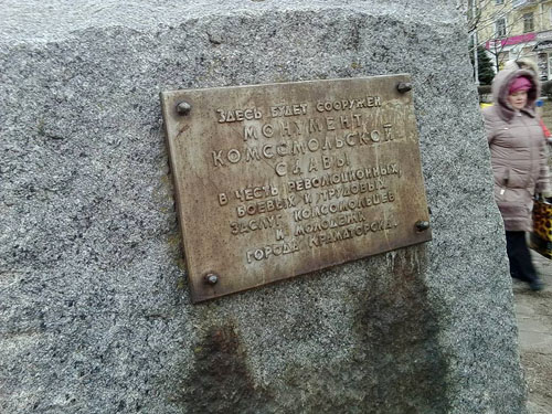 Сегодня, 20 февраля, в Краматорске явочным порядком был продолжен процесс "декоммунизации": гранитный камень на Комсомольской площади, где несколько десятилетий подряд всё обещали, но так и не поставили памятник комсомольцам, лишился соответствующей таблички.