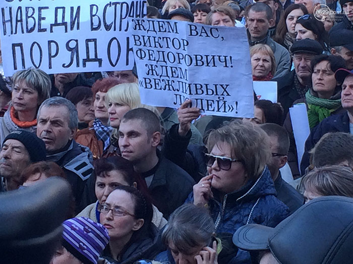 В апреле 2014 года на одном из митингов под Мариупольским горсоветом стояла женщина и держала в руках плакат «Ждем вежливых людей».