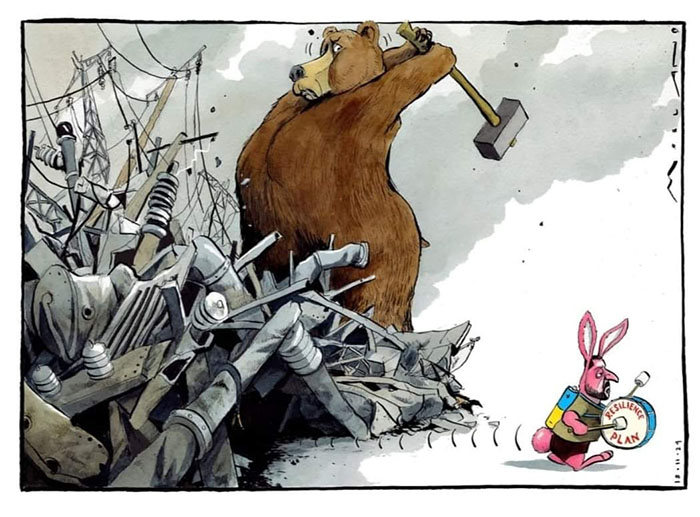 Росія тут величезний, сильний, гарний ведмідь, який має велику кувалду, а Україна - це маленький, рожевенький кролик на батарейці, який продовжує бити в барабан з написом "план стійкості"