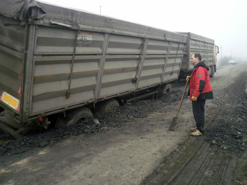 В результате, как сообщает Служба автомобильных дорог в Донецкой области, колеса прицепа грузовика застряли в дорожном покрытии.