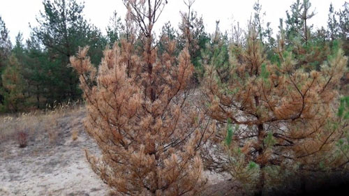 Странный внешний вид леса в районе Лимана привлекает внимание специалистов и общественности: целые гектары хвои имеют рыжий окрас, а при ближайшем рассмотрении выясняется, что деревья покрыты гусеницами!