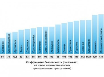 Результаты оказались весьма неожиданными. Надо сказать, что лидером по безопасности оказался Волновахский район (с солидным процентом сельского населения), а аутсайдером – город Славянск при разнице в коэффициенте безопасности меж ними примерно втрое. Еще одним открытием стало то, что территориальная близость городов друг к другу абсолютно не влияют на коэффициент безопасности: Краматорск и Славянск размещены абсолютно недалеко, а разница в уровне безопасности у их – 13 пунктов. А вот в Донецке и Мариуполе шанс оказаться жертвой преступления не самый высокий - один из 100.