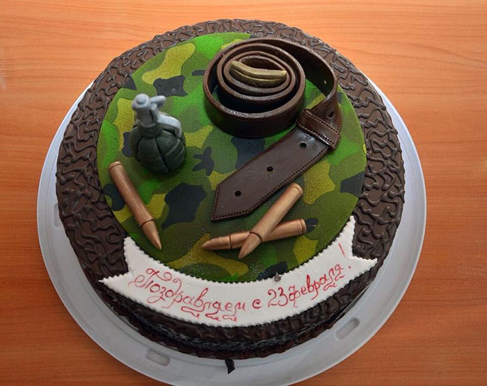 Изюминкой же привезенных угощений стал торт с любовно вылепленными кремовыми гранатой, патронами и солдатским ремнем.