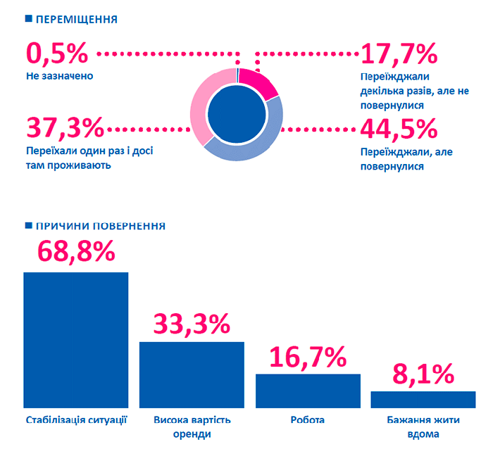 Основная причина возвращения (68,8%) - это стабилизация ситуации в зоне оккупации. Около 33,3% вернулись по причине высокой стоимости аренды жилья для вынужденных переселенцев.