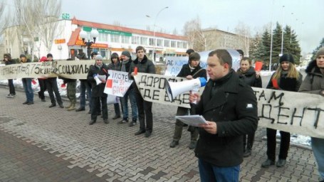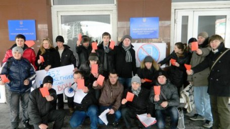 Перед зданием Енакиевского горсовета 6 марта около 30 человек провели акцию «Красная карточка Януковичу».