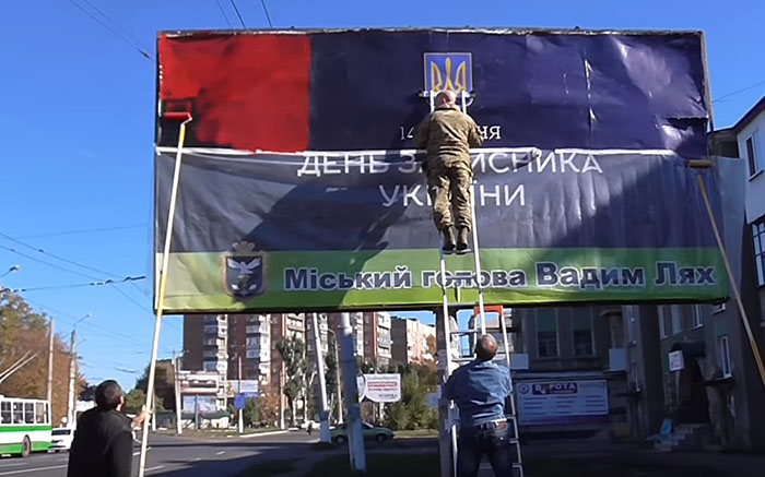 В Славянске члены местной организации ВО "Свобода" и присоединившиеся к ним гражданские активисты внесли кое-какие цветовые коррективы на билборде с приветствием городского головы Вадима Ляха к Дню защитника Украины.