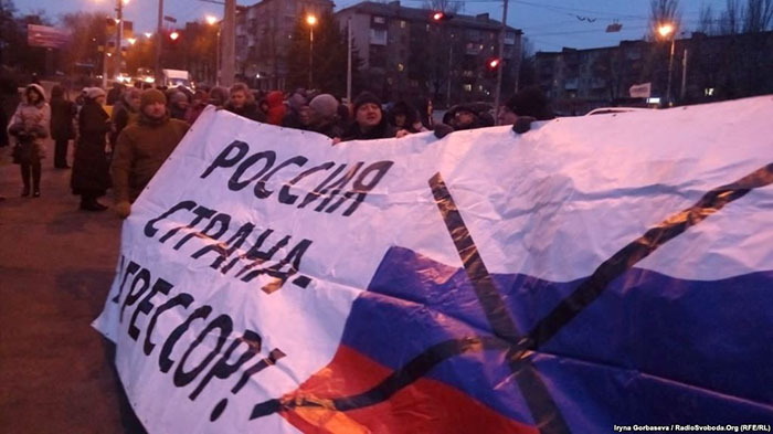 Как сообщают городские Интернет-издания, люди вышли на площадь с плакатами «Россия – страна агрессор», «Нет блокаде Азовского моря», «Russia = Somali».