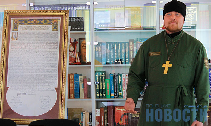 Как рассказал изданию «Донецкие новости» военный капеллан воинской части 3035 Славянского полка Национальной гвардии Украины, игумен Дионисий, это копия Томоса на сегодняшний день единственная на Донбассе.