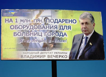 Между тем, пишет издание, нардеп Владимир Вечерко в Славянске уже отметился в предвыборном скандале: его команда расставила билборды "Подарено оборудования для больниц города на 1 миллион гривен. Я обещал, я делаю!". Только выяснилось, что больнице помогли в одном - единственном городе, а рекламу развесили по всему округу.