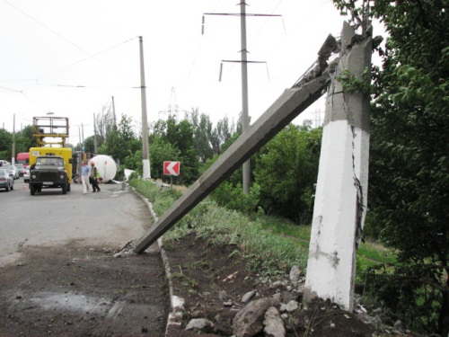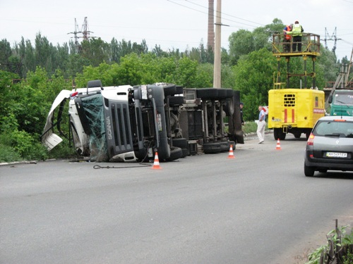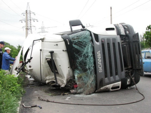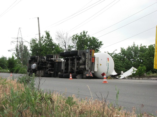 Вчера днем в Славянске, в районе 34-го дома по улице Современной, попал в дорожно-транспортное происшествие грузовик Scania компании "Параллель", с цистерной, предназначенной для перевозки сжиженного газового топлива.