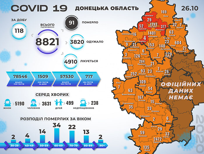 Итак, за понедельник, 26 октября, коронавирусную болезнь в Донецкой области диагностировали еще в 118 человек, в том числе у 4 детей: