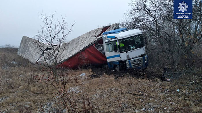 Как сообщает Патрульная полиция, сегодня, 1 февраля, на 649-м километре автодороги М-03 (Киев-Довжанский), 40-летний водитель Renault magnum, двигаясь в направлении Славянска, не выбрал безопасную скорость движения, не справился с управлением и выехал за пределы проезжей части. В результате грузовик перевернулся на бок.