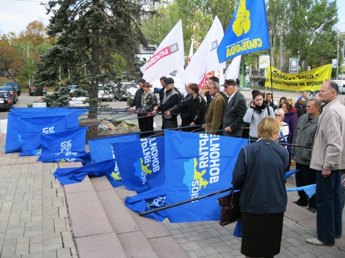 По завершению митинга фермеры прошли к зданию Донецкой областной государственной администрации и бросили к нему флаги Партии регионов.