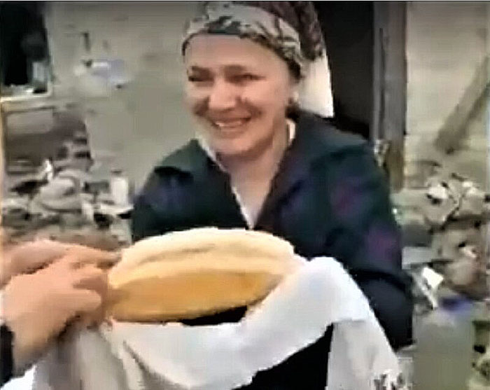 Хліб-сіль російським окупантам вручає дружина настоятеля цього храму Ольга Фоменко.
