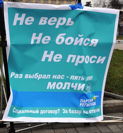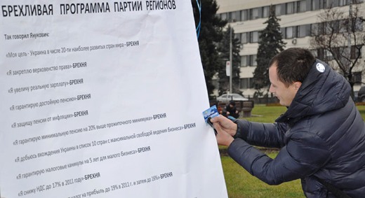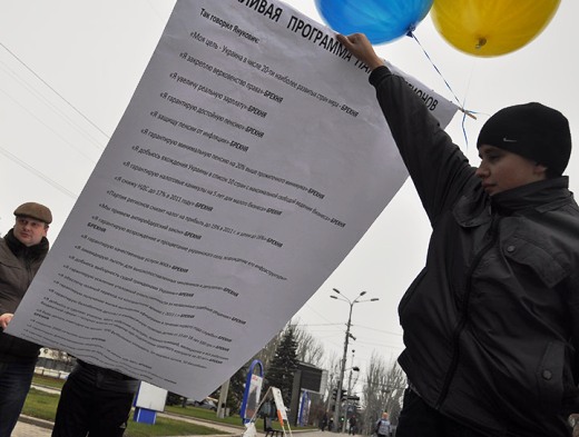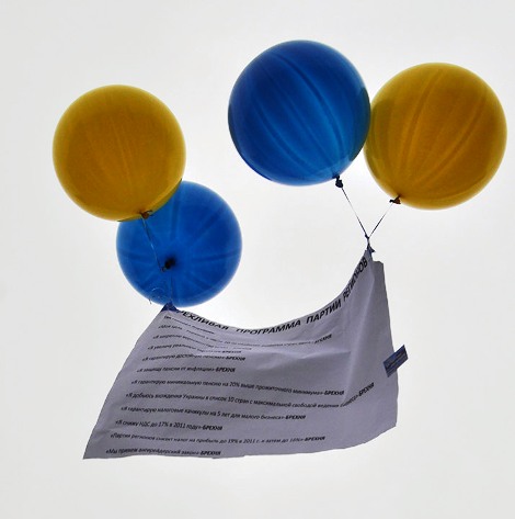 Кроме того, активисты подготовили и послание главе государства в Межигорье: обещания из предвыборной программы президента и Партии регионов, которые так и остались невыполненными. Плакат оказался настолько длинным, что его не смогли поднять шары, наполненные гелием. Активистам пришлось отрезать часть листа.