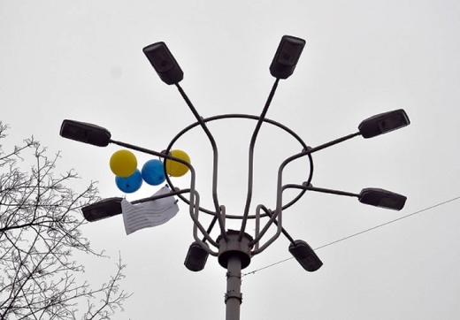 Послание до Межигорья не долетело: плакат с шарами застрял на фонаре на площади Ленина.
