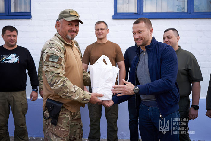 Разом із волонтерами дрони вручали колишній очільник Донецької ОВА, а нині голова Антимонопольного комітету України Павло Кириленко та заступники голови ДонОВА Вадим Філашкін, Денис Клюшников і Максим Сандига.