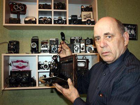 Гордостью 60-летнего коллекционера является профессиональная плёночная камера «Nikon F5». Среди советских фотокамер - серии «Зенитов», «Киев», харьковских «ФЭД». Красуются несколько аппаратов «Ленинград» и «Вега». Есть простенькие «Смены» и «Чайки», ставший уже редкостью подарочный вариант «Фотокор». Имеется и достаточно продвинутый в 80-е первый цифровой фотоаппарат фирмы «Sony». В него вместо привычной нам теперь карты памяти вмонтирована съёмная пятидюймовая дискета. А советский панорамный аппарат «Горизонт», выпущенный в 70-м году, со знаком качества, за один взвод и сейчас послушно отщёлкает семь кадров для развёрнутого снимка. Есть и около десятка кинокамер марок «Экран», «Кварц» и «Красногорск». Не считая двух десятков «дублей» (аппаратов одной и той же марки и года выпуска).