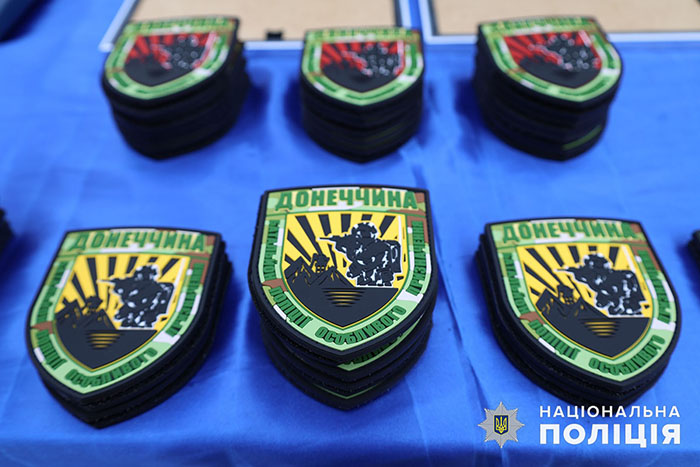 Завершились тренування бойовим злагодженням. Начальник Головного управління Нацполіції в Донецькій області Руслан Осипенко вручив поліцейським прапор підрозділу. На полотні, як і на шевронах бійців, - рідні терикони та сонце Донеччини.