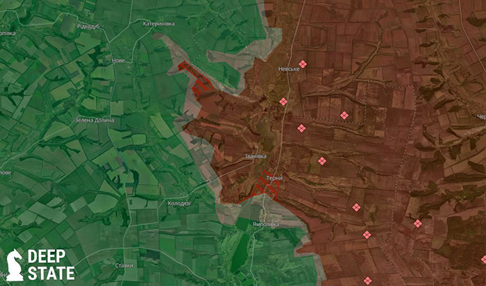"Противник здійснює тиск на Катеринівку, підбираючись до села впритул і пробує закріплятися на даній ділянці. Одночасно з цим пробує розвивати успіх в напрямку населених пунктів Нове та Зелена Долина", - пишуть монітори.