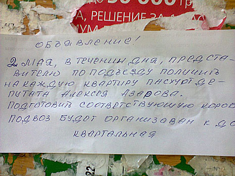 В сети Фейсбук появились забавные фотографии объявлений, развешанных на многоэтажных домах Славянска. Головам домкомов приказано подготовить коробки под куличи, и старшим по подъездам предстоит раздать подарки всем жильцам.